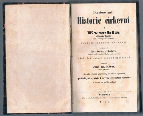 | Title | Desatero knih Historie církevní od Evsebia příjmením Pamfili řeckým jazykem sepsané, potom od Jana Kocína z Kocinétu, předního písaře radního v Menším městě pražském, z řeči latinské v českou přeložené, nyní od Jana Ev. Krbce, kněze církevního, s řeckým čtením srovnané, na mnoze opravené, příhodnými výklady i novým letopočtem opatřené a znova na světlo vydané. |
