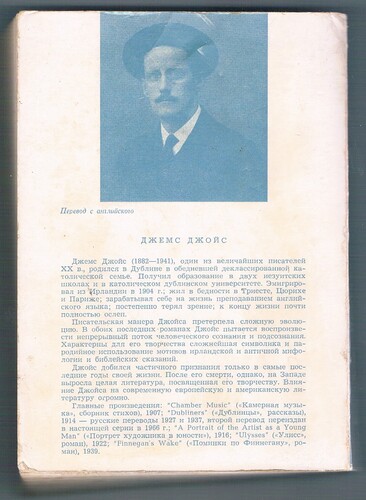 First thus. Paperback, light blue covers printed in white. 367 pp.. Text in Russian. Some foxing to fore-edges, slightly cocked (lean). Edges a little rubbed. Complete and tight. Generally good condition. An interesting and rather scarce edition. Translated by Viktor Frank. “An emigre, Viktor Frank, published a translation of’ A Portrait of the Artist’ abroad [Italy] in 1968, but one did not appear in the Soviet Union until 1976, although it had been quoted from in manuscript as early as 1937!” (Monas, 1993).