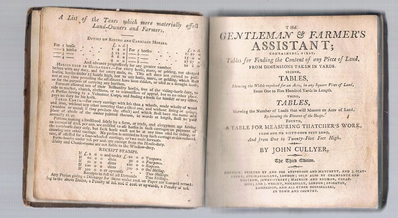 | Title | The Gentleman & Farmer's Assistant (signed); containing first, Tables for Finding the Content of any Piece of Land, from Dimensions taken in Yards. Second, Tables, Shewing the Width required for an Acre, in any Square Piece of Land, From One to Five Hundred Yards in Length. Third, Tables, Shewing the Number of Loads that will Manure an Acre of Land, By knowing the Distance of the Heaps. Fourth, A Table for Measuring Thatcher’s Work from one to Sixty-Four Feet Long, And from One to Twenty-Five F |