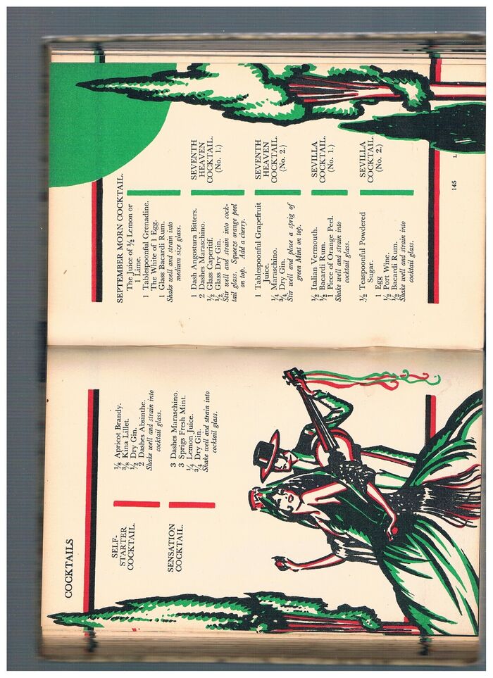 Octavo, 287pp. Original striking Art Deco illustrated boards over original black cloth spine lettered in gilt, decorated endpapers, cheerful brightly coloured graphics throughout by Gilbert Rumbold. 2p. advertisement for Booth’s Gin between half-title verso and title. 2pp. additional cocktails in back before 3 pp. ruled blanks for notes.